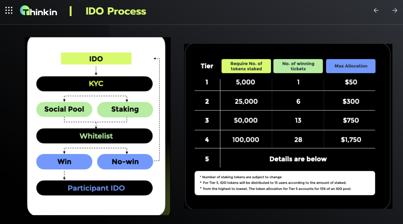 The staking pool is a pool with allocations for lottery participants. The lottery tickets are given out to people who staked $THINK or POPO NFT. Allocations and tickets differ from the Tiers each person gets, which is decided by the amount they staked and the level of NFT's raffle attribute. Also the number of tickets people receive depends on the amount they staked and the level of NFT's raffle attribute, and in order to participate in our IDOs people must follow the following steps.